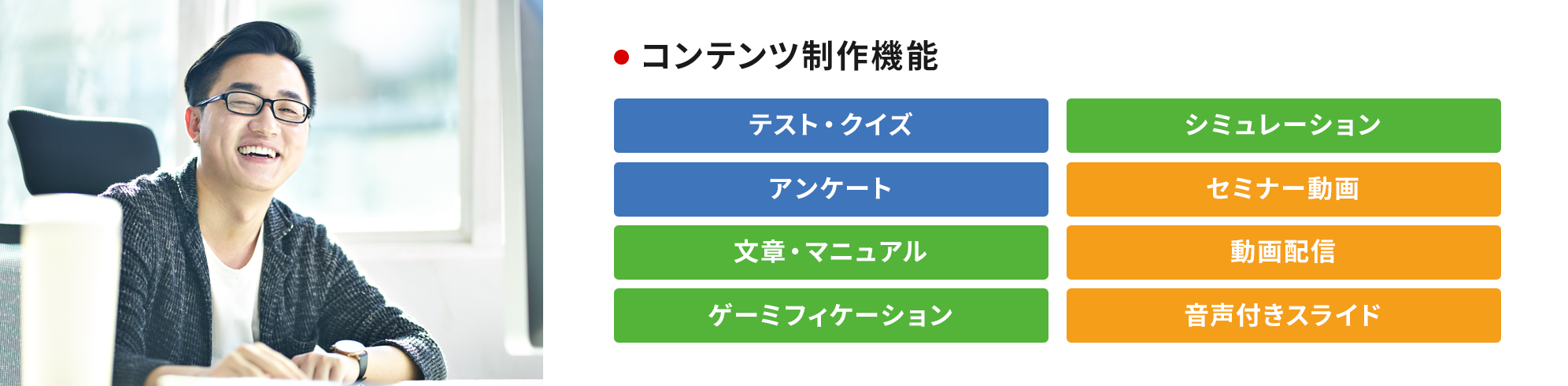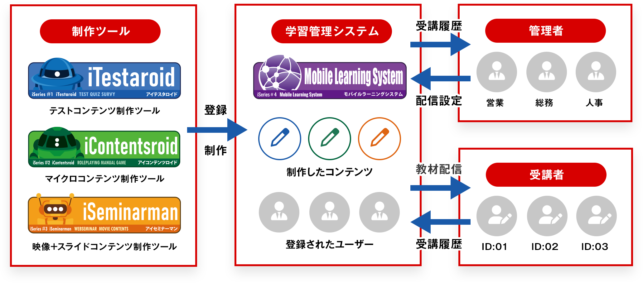 制作ツールでは個性あふれる楽しいマイクロラーニングコンテンツが創れ、それらを管理システムにアップすることで配信や学習進捗など学習履歴管理が可能となります。